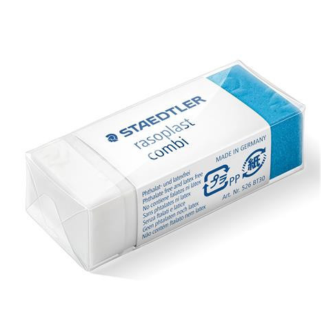 Radír, kombinált, STAEDTLER Rasoplast Combi 526 BT Kiváló minőségű termék a kényelmes radírozásért -a kék rész tinta, a fehér rész ceruza radírozására alkalmas -papírtokkal -egyenként fóliázva -minimális morzsolódás -méret: 43x19x13 mm Gyártó