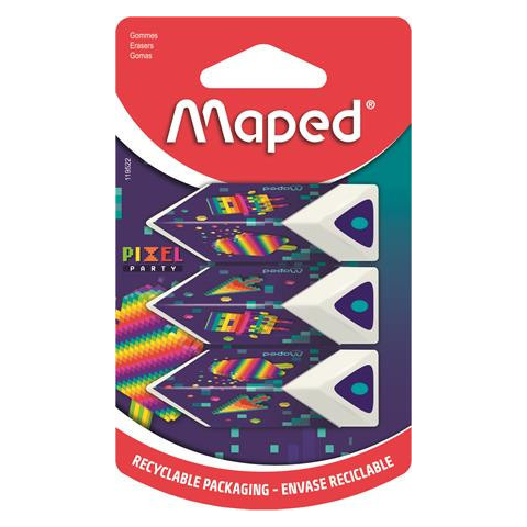 Radír, MAPED Pixel Party Pyramid , 3 darab A Maped Pixel Party kollekciójával egy retro-futurisztikus környezetbe csöppenhetünk, mely fiúknak és lányoknak egyaránt vonzó világot jelent. Egyedi megjelenésű radírok, melyek ötvözik az ergonómiát és az