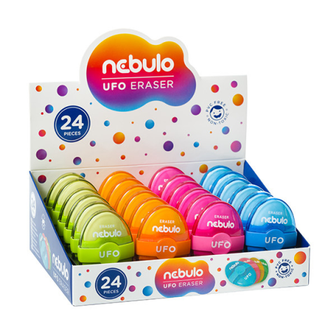 Radír NEBULO műanyag tokos 64x42x22mm Ufo Radír színes, ergonomikus műanyag tokban, amely mindkét oldalról nyitható. Ideális ceruzavonalak radírozásához. PVC mentes, nem tartalmaz egészségre káros anyagot. A narancs, ciklámen, kék, zöld színű, műanyag