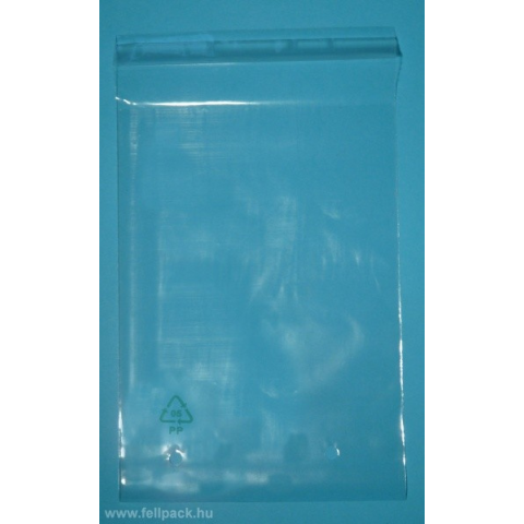 Ragasztócsíkos BOPP (celofánszerű) tasak. PP jelzés és 5 mm-es szellőzőlyuk található rajta. A legkisebb választható mennyiség: 100 db,1000 db-os kiszerelés esetén kedvezőbb az ára