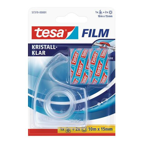 Ragasztószalag-adagoló, kézi, TESA + 2 db 15mm x 10 m ragasztószalag kézi adagoló cserélhető betéttel 2 db tesafilm® 15 mm x 10 m Crystal & Clear kristálytiszta szalaggal együtt hullámos penge a szalag megbízható és pontos vágása érdekében Gyártó/első