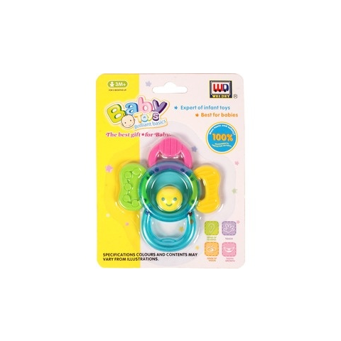 Rázd és rágcsáld a kis állatkát! A Rágókás műanyag csörgő egy kétfunkciós bébijáték, ami fejleszti a baba érzékszerveit! A csörgő színes golyókkal van töltve, amik csörgő-zörgő hangot adnak ki magukból. A csörgő két szárnya lapos műanyagból készült, és miközben rágcsálja a pici, csillapodik a növekedő fogak kellemetlen érzése. A Rágókás műanyag csörgő babakocsira, kiságyra is felfogatható. Méretek: 9 x 11 cm.