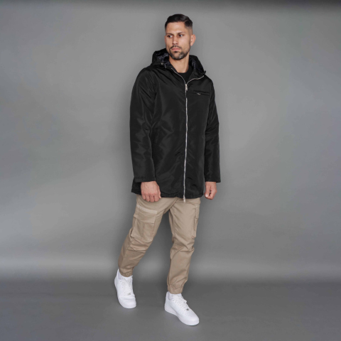 Regular Fit, fekete cipzáros dzseki, kapucnival, cipzáros mellzsebbel és két oldalsó zsebbel Modell: 185 cm/ 85 kg/ L-es méret