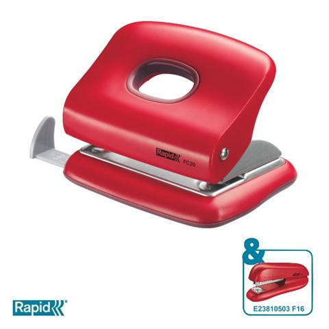 Lyukasztó, kétlyukú, 20 lap, RAPID FC20, meggyvörös - erős, fém lyukasztó megerősített, ABS műanyagból készült karral és talppal - otthoni, iskolai és irodai használatra - az erős, fém konstrukció tökéletes lyukasztást eredményez - könnyen üríthető, mű