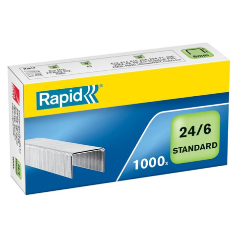 Tűzőkapocs, 24/6, horganyzott, RAPID Standard - finomhuzal tűzőkapocs (20 lapig) - 2-20 lap tűzéséhez (80 g-os papír) - STANDARD erősség, melyet a csomagoláson zöld szín jelöl - 6 mm szárhossz - galvanizált finomhuzal a könnyű és kényelmes használatért