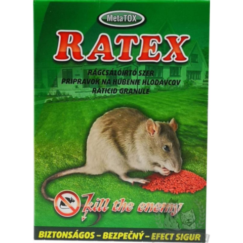 A RATEX rágcsálóirtószer granulátum patkányok, egerek irtására felhasználható, második generációs, véralvadásgátló hatóanyagot tartalmazó irtószer, amely már egyszeri fogyasztás után is elpusztítja a rágcsálókat. Az irtószer BITREX-et tartalmaz, mely egy