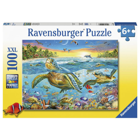 Ravensburger: Puzzle 100 db - Teknősök találkozója (53588) Tengeri teknősök egy csoportja élvezi a kristálytiszta tengert ebben a gyönyörűen illusztrált jelenetben. Egy zátony körül úsznak, ahol élénk színű trópusi halak nyargalnak a különböző színű korallok között. A távolban egy delfin ugrik ki a hullámok közül, aranyló homokos strandok és zöld pálmafák. A jelenet a kora esti órákban játszódik, az ég tele van madarakkal. A távolban a lenyugvó