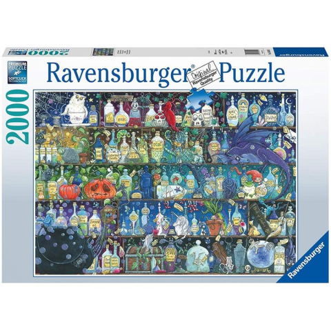 Ravensburger Puzzle 2000 db A méregkeverő szekrény (41330) Ismerkedj meg a bájitalokkal és rakd ki őket színes puzzle-öddel! A Puzzle 2000 db - A méregkeverő szekrényben mindent megtalálsz egy jó kis ital elkészítéséhez. A kísérteties tároló telis teli van varázslattal, ami könnyedén elindítja a fantáziád! Rakd ki a 2000 darabból álló puzzle-t és vedd szemügyre, milyen mérgeket is rejt a tikos szekrény. A részletgazdag kép segítségedre lesz a puzzle e