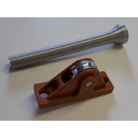 Redőnyzsinór bevezető Fém görgővel és 10 cm-es rugóval. 5 mm-es zsinórhoz. Aranytölgy színű. Szállítási idő 2-3 munkanap. V