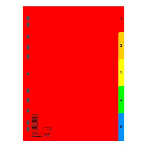 Regiszter DONAU A/4 műanyag 1-5 részes színes 11 lefűzőlyukkal ellátott regiszter 1-5-ig számozva, 5 színben a dokumentumok áttekinthetőségéhez iratrendezőkben, gyűrűskönyvekben.