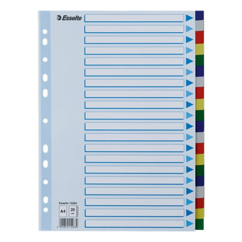 Regiszter ESSELTE A/4 műanyag 20 részes Regiszter ESSELTE Elválasztólap. Megerősített hagyományos, 11-lyukú lefűzőrész. Méret: A/4, 225x3x297 mm. Regiszterek száma: 20 színes fül. Alapanyag: 0,12 mm vastag PP. Súly: 0,14 kg. Szín: Több színű.