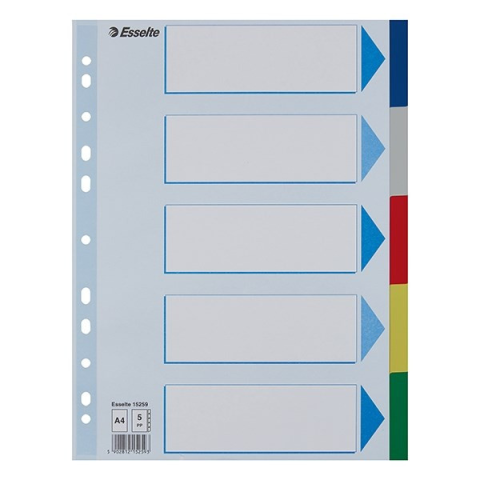 Regiszter ESSELTE A/4 műanyag 5 részes Elválasztólap visszafogott színkombinációkban. Nagyméretű téglalapok az előlapon a tartalom feltüntetésére. Megerősített lefűzőrész az előlapon 5 színes fül a könnyű rendszerezéshez Hagyományos, 11-lyukú lefűzőrés