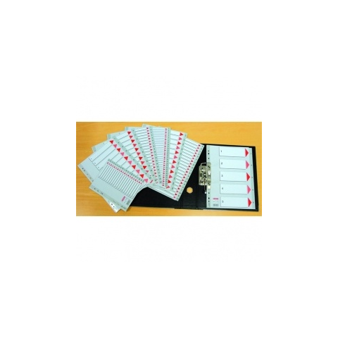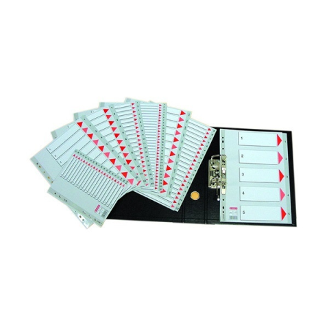 Szürke színű regiszter. Nagyméretű téglalapok az előlapon a tartalom feltüntetésére. Megerősített lefűzőrész az előlapon. 1-12 felirattal rendelkező regiszter fülek a dokumentumok gyors eléréséhez. Hagyományos, 11-lyukú lefűzőrész. A4 méret. 0,12 mm vastag PP alapanyag.