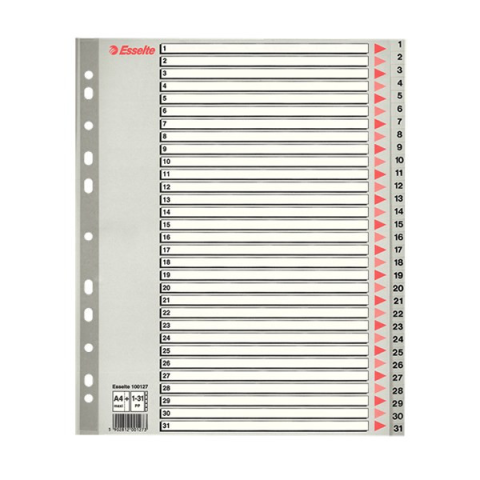 Regiszter ESSELTE A/4 műanyag extra széles 1-31 Szürke színű regiszter. Nagyméretű téglalapok az előlapon a tartalom feltüntetésére.