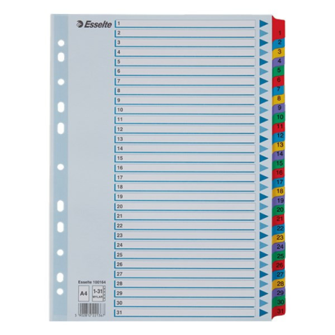Regiszter ESSELTE Mylar A/4 laminált karton 1-31 - tartós regiszter élénk színkombinációkban - nagyméretű téglalapok az előlapon a tartalom feltüntetésére - megerősített lefűzőrész az előlapon - erős, tartós, laminálással megerősített regiszter füle