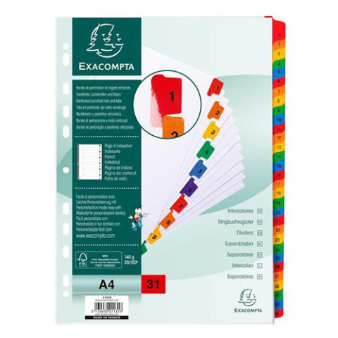 Regiszter karton Exacompta A/4 31 részes fehér, színes laminált fülekkel Méret: A/4Kiváló minőségű fehér karton regiszterek, színes laminált fülekkelAlapanyag: 160gr-os kartonElőre lyukasztott, így lefűzhető mappába vagy dossziébaFSC minősítéssel rende