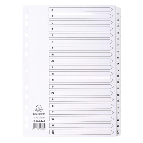 Regiszter karton Exacompta A/4 A-Z 20 részes fehér Méret: A/4Kiváló minőségű fehér karton elválasztólapok, laminált fülekkelAlapanyag: 160gr-os kartonElőre lyukasztott, így lefűzhető mappába vagy dossziébaFSC minősítéssel rendelkező termék