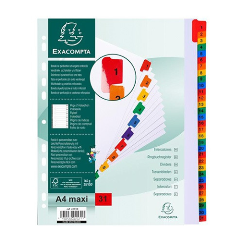 Regiszter karton Exacompta A/4 MAXI 1-31-ig laminált fülekkel Méret: A/4 maxiKiváló minőségű fehér karton regiszterek, színes laminált fülekkelAlapanyag: 160gr-os kartonElőre lyukasztott, így lefűzhető mappába vagy dossziébaFSC minősítéssel rendelkező