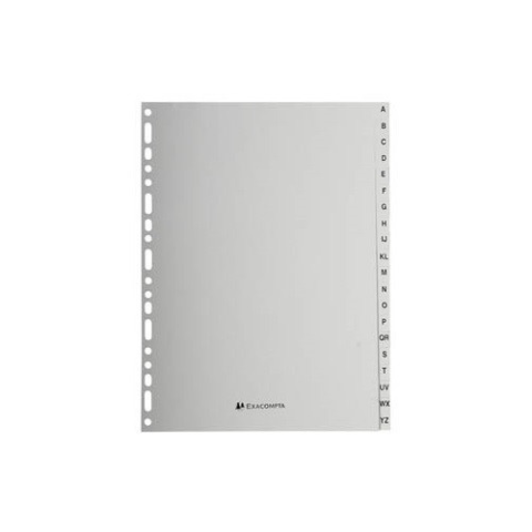 Regiszter PP Exacompta A/4 A-Z-ig szürke Méret: A/4Kiváló minőségű szürke, műanyag regiszterekAlapanyag: 120 mikronos műanyagElőre lyukasztott, így lefűzhető mappába vagy dossziéba