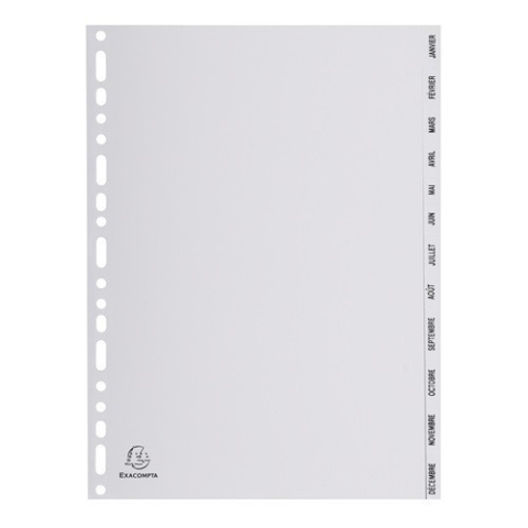 Regiszter PP Exacompta A/4 Jan-Dec-ig 12 részes szürke Méret: A/4Kiváló minőségű szürke, műanyag regiszterekAlapanyag: 120 mikronos műanyagElőre lyukasztott, így lefűzhető mappába vagy dossziéba