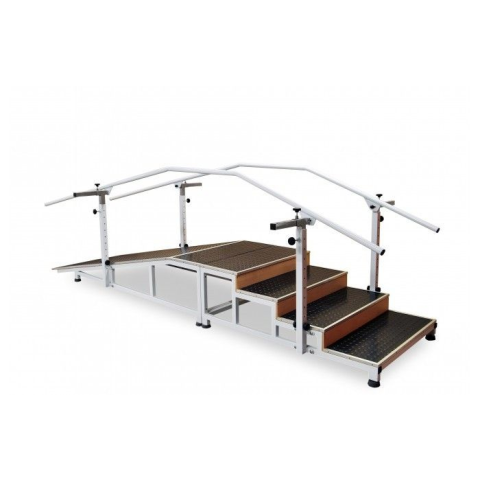Rehabilitációs eszköz , járásjavításhoz lépcsővel és rámpával Hosszúság: 330 cm Maximális szélesség: 130 cm Járólap szélesség: 75 cm Korlát magassága állítható: 60 cm - 100 cm Korlát szélessége állítható: 34 cm - 70 cm Rámpa állít