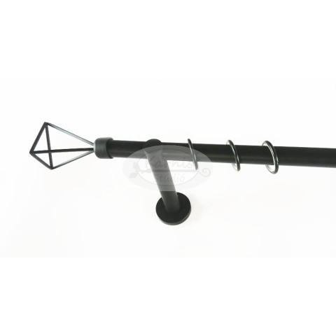 A REIMS fekete színű 1 rudas 19 mm átmérőjű fém karnis szett tartalma: 1 db 19 mm átmérőjű fekete színű fém karnis cső a kiválasztott hosszúságban 2 db Reims típusú fekete színű fém karnis végzáró 2 db falra szerelhető fém konzol a karnisrudak hosszának