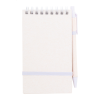 Újrahasznosított tejesdoboz anyagú spirálfüzet kemény borítóval és 70 vonalas lappal. Hozzáillő színű spirálgyűrűkkel, gumipánttal és tolltartóval. Újrahasznosított tejesdoboz és újrahasznosított ABS műanyag golyóstollal, kék tollbetéttel. A6 méretű.