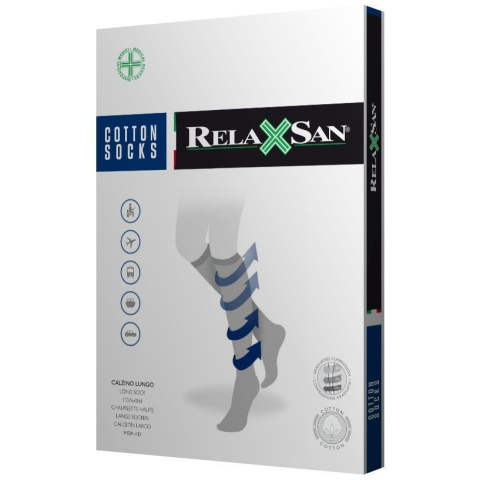 Pamut térdzokni | 140 den Kompresszió a bokánál: 22-27 mmHg - Vénás elégtelenség, visszér, ödéma, érgyulladás terápiájában, sebészeti beavatkozások után és a trombózis megelőzésénél javallott. A RelaxSan pamut térdfix fokozatos kompressziója miatt ülőm