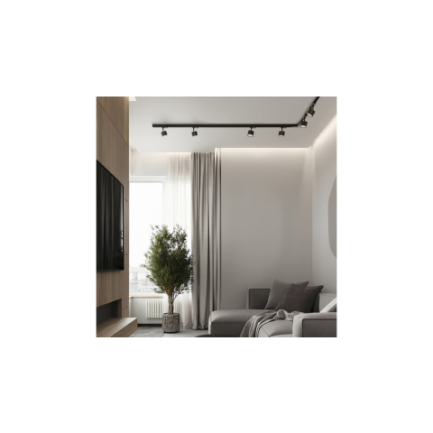 Háromáramkörös EUTRAC sín. Bármilyen profilt könnyen méretre lehet vágni. A vezetékek végeit nem szükséges levágni vagy meghajlítani. Halogén fényforrások használata esetén a minimális felszerelési magasság 2,5 m. Ennél alacsonyabb belmagasság esetén LED fényforrásokat javaslunk.