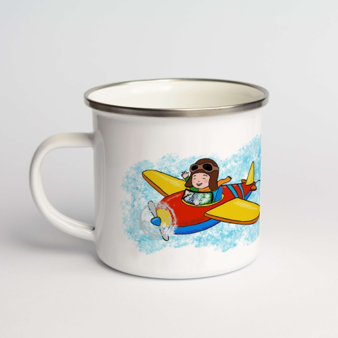 Zománcozott fém bögre repülős mintával, amely a zászló feliratának cseréjével névre szólóvá is tehető. A fém anyag miatt mikrohullámú sütőbe nem tehető be. Mosogatógépben tisztítható.