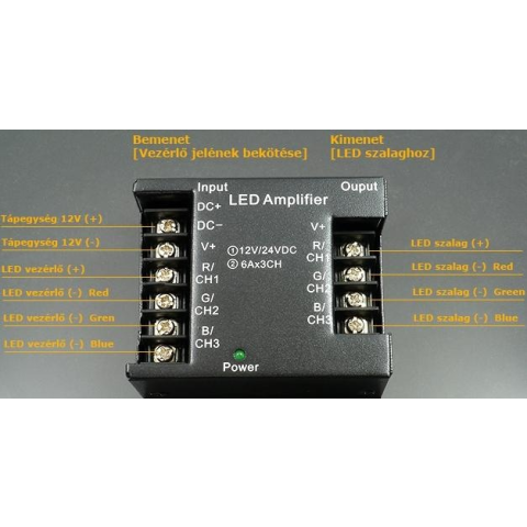 Feszültség: 12/24 Volt DC Max. teljesítmény: 216 Watt Max. áremerősség: 3x6A RGB vezérlő méretei: 80 mm x 72 mm x 32 mm Sorkapcsos bekötés Jelerősítő egység RGB LED vezérlőkhöz, illetve LED fényerő szabályzókhoz. A jelerősítő segítségével az rgb ve