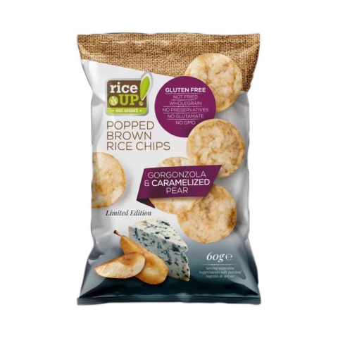 Teljes kiőrlésű barna rizs chips gorgonzola sajt és karamellizált körte ízesítéssel.