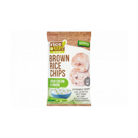 Gluténmentes, Nem olajban sült. Teljes kiőrlésű barna rizs chips hagymás-tejfölös ízesítéssel.