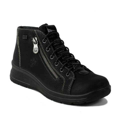 Fekete színű Rieker Tex téli bokacipő. A Rieker Memosoft talp rendkívül nagy hajlékonyságot és rugalmasságot ad a cipőnek, így védi a gerincet a  megterheléstől, kényelmes viseletet biztosít egész napra