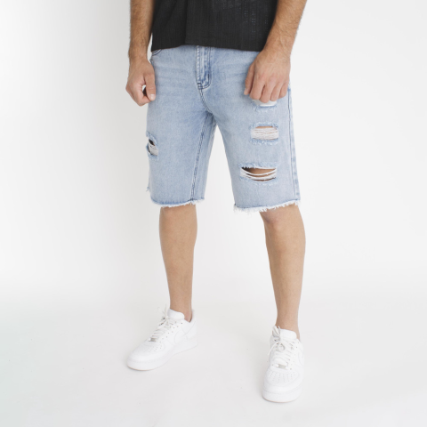 Regular Fit, kék szaggatott farmer rövidnadrág, elöl hátúl két zsebbel, cipzáras sliccel Modell: 185 cm/ 85 kg/ 33-as méret