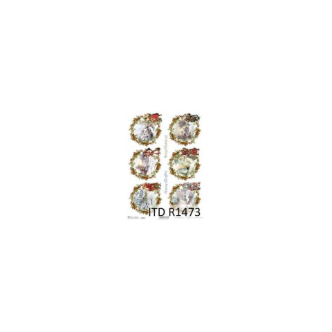 Téli, karácsonyi rizspapír, Kerek képek Télapóval. A4 méretű, 30–35 GSM súlyú rizspapír, kissé áttetsző tónusban. Jól látható, szabálytalan méretű szálakat tartalmaz, amelyek minden irányban helyezkednek el a papír felületén, eredeti megjelenést és szerkezetet kölcsönözve neki. A papír szokatlanul erős és tartós, nem málik szét a kézben. Könnyen ragasztható a dekupázstechnikában használt bármely alaphoz (üveg, fa, MDF, polisztirol hab stb.), bármi
