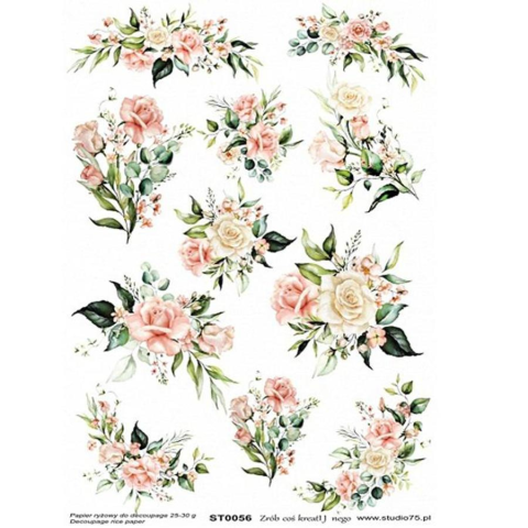 A4 méretű, 30–35 GSM súlyú rizspapír, kissé áttetsző tónusban. Jól látható, szabálytalan méretű szálakat tartalmaz, amelyek minden irányban helyezkednek el a papír felületén, eredeti megjelenést és szerkezetet kölcsönözve neki. A papír szokatlanul erős és tartós, nem málik szét a kézben. Könnyen ragasztható a dekupázstechnikában használt bármely alaphoz (üveg, fa, MDF, polisztirol hab stb.), bármilyen dekupázs ragasztóval.
