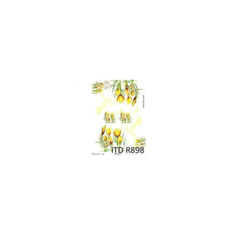 Rizspapír, Sárga krókuszok. A4 méretű, 30–35 GSM súlyú rizspapír, kissé áttetsző tónusban. Jól látható, szabálytalan méretű szálakat tartalmaz, amelyek minden irányban helyezkednek el a papír felületén, eredeti megjelenést és szerkezetet kölcsönözve neki. A papír szokatlanul erős és tartós, nem málik szét a kézben. Könnyen ragasztható a dekupázstechnikában használt bármely alaphoz (üveg, fa, MDF, polisztirol hab stb.), bármilyen dekupázs ragasztóva
