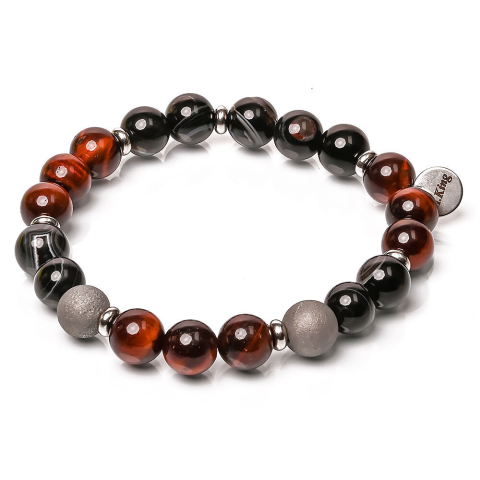 RUGALMAS KARKÖTŐ, a mérete választható. Az ékszer ásványai és tartozékai: – 10 mm-es vörösesbarna tigrisszem gyöngyök – 10 mm-es fekete csíkos ónix achát gyöngyök – 10 mm-es szürke DRUZY achát gyöngyök – Ezüst színű dí