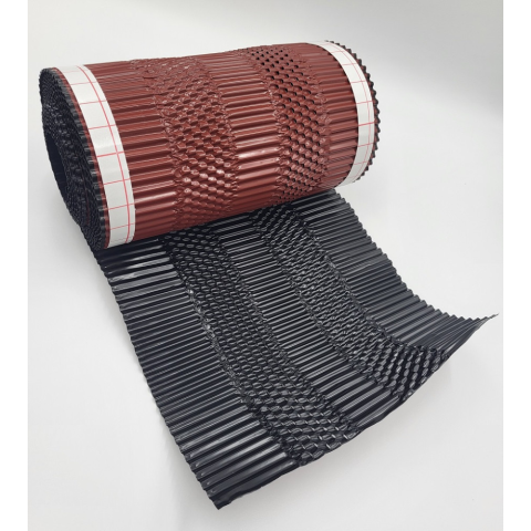 Univerzális szellőző gerincalátét elemként a kúpcserép alatti kiszellőzést biztosítja fokozott vízzárás és porhózárás mellett, tető- és élgerincen is. Anyaga: perforált alumínium szalag, felső oldalán poliészter festék bevonattal, alsó oldalán butilcsí