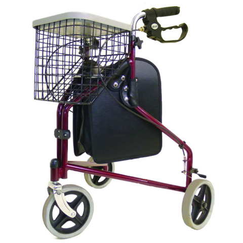 1 kép Rollátor 3 kerekű DRIVE vörös táskával, kosárral és tálcával