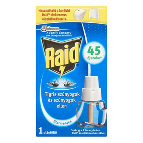 Rovarírtó szúnyogirtó RAID utántöltő elektromos készülékhez illatmentes 27ml Utántöltő RAID szúnyogirtó elektromos készülékhez illatmentes 27ml. A Raid® elektromos szúnyogirtó készülék egész éjszakára nyújtó védelmet biztosít a szúnyogok ellen. Hatását