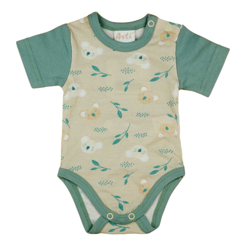 Bájos, zöld színű, rövid ujjú baba body, amely egy cuki koalás mintával lett díszítve. Kényelmes választás a melegebb napokra, a vállán található patentnak köszönhetően pedig egyszerűen fel- és leöltöztethető a kicsi. Az Andrea Kft. által készített magyar