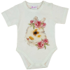 Ez a rövid ujjú baba body igazi alapdarab a kisbabák ruhatárában, mely tökéletesen kombinálható más ruhadarabokkal. A natúr színű bodyt aranyos, virágos, nyuszis minta díszíti, mely igazán bájos látványt nyújt. Készült belőle gondosan, odafigyelve a legki