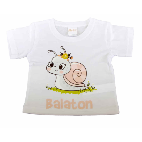 Egy igazán bűbájos, rövid ujjú póló, amelyen a Balaton csigás mintája tündöklik. Az unisex dizájn és a fehér szín minden gyermeken jól mutat, legyen szó kislányról vagy kisfiúról. A póló puha, bőrbarát anyagból készült, ami tökéletes választás a gyermekek