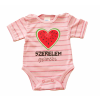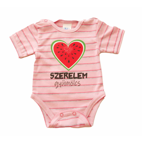Rövid ujjú dupla patentos " Szerelem gyümölcs" feliratú baba body kombidressz, body árgrafikon
