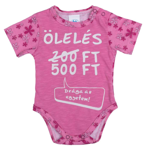 Rövid ujjú feliratos baba body Egy rövid ujjú baba body, amely igazán különlegessé teszi a pici mindennapjait. A világos pink alapszínű, virág mintás kis ruhadarabon játékos felirat látható, amely mindenkit mosolyra hangol. A vállon található patentok me