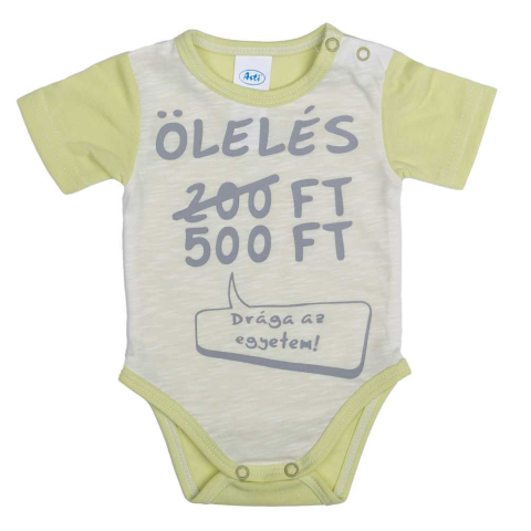 Rövid ujjú feliratos baba body Egy rövid ujjú baba body, amely igazán különlegessé teszi a pici mindennapjait. A nyers alapszínű, kis ruhadarabon játékos felirat látható, amely mindenkit mosolyra hangol. A vállon található patentok megkönnyítik az öltözk