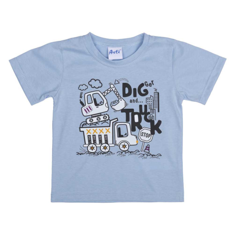 Rövid ujjú fiú póló markoló és teherautó mintával Öltöztesse kisfiát ebbe a világos kék rövid ujjú pólóba, melyet egy igazi kis kalandor számára terveztek! A póló kiváló minőségű, 100% pamut anyagból készült, mely puha, légáteresztő, és bőrbarát - azaz t