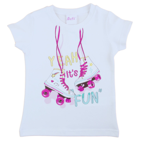 Rövid ujjú lány póló görkori mintával Öltöztesse kislányát ezzel a rendkívül cuki, rövid ujjú pólóval, melynek fehér színe és görkori mintája rögtön felvidítja a napját. A puha, bőrbarát 100% pamut anyag garantálja a ké